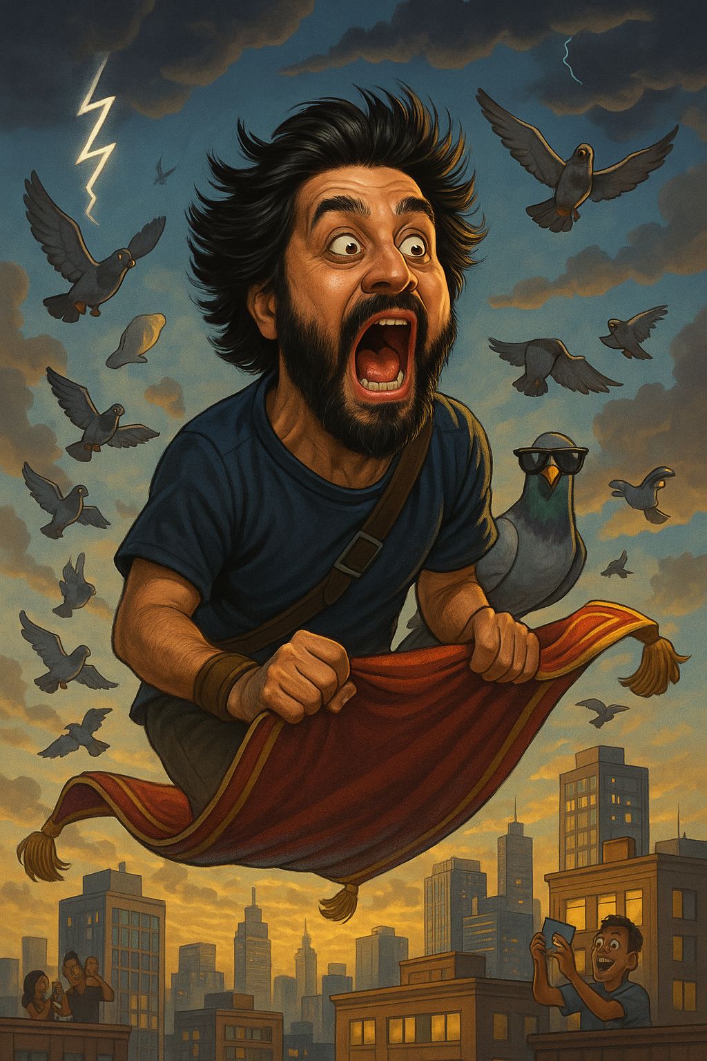 A hyperrealistic yet comically exaggerated scene of a South Asian man mid-scream, soaring out of control on a flying magic carpet above a crowded modern city. His eyes bulge, mouth wide open in panic as his hair flails wildly in the air. A pigeon wearing sunglasses calmly rides beside him on the carpet, adding surreal comedy to the chaos. Below, people on rooftops laugh and record the scene on their phones. Thunderbolts crack in the sky as the magic carpet loops and dives. The entire artwork blends cartoon energy with cinematic lighting, creating a hilarious viral moment. Style: Pixar-meets-realism, detailed expressions, dynamic motion, comedy fantasy.