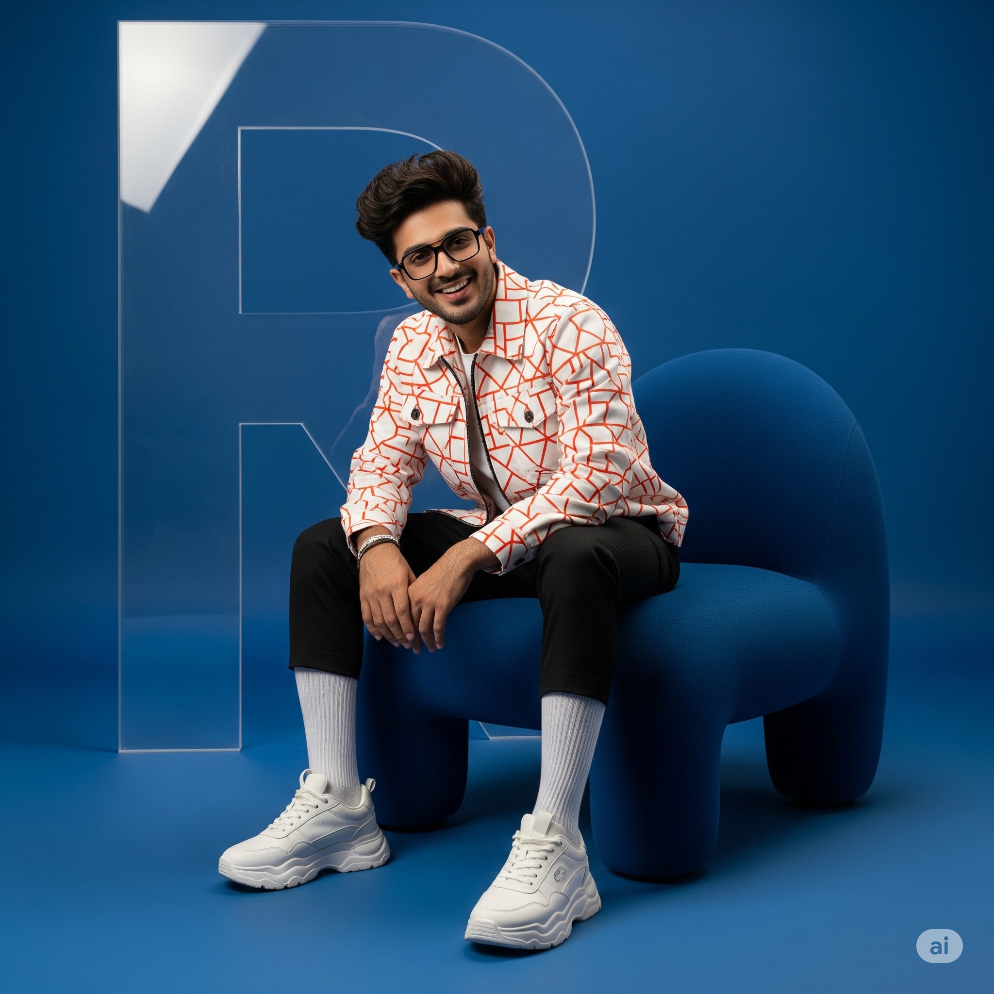 A stylish young handsome Pakistani man with messi coma hair and black modern glasses, smiling confidently while sitting on a bold, amorphous deep-blue designer armchair. He wears a white-and-orange geometric patterned jacket and matching black pants, white long socks, and chunky white sneakers. The background is minimalist blue with a large transparent stylized R' shape behind him. Studio lighting, high-fashion editorial vibe, bold and playful composition.