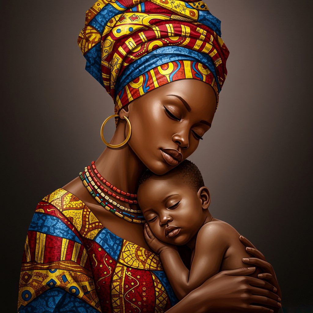 A stylized digital painting of an elegant African mother tenderly embracing her sleeping child. Both figures wear vibrant, intricately patterned headwraps and garments designed in a mosaic style with bold, colorful geometric shapes—featuring shades of red, blue, yellow, green, and textured metallic accents. The mother has smooth, glowing skin, delicate facial features, and closed eyes expressing peace and love. The child rests gently against her chest, eyes also closed, lips slightly parted with a calm expression. The background is a soft, gradient dark tone to enhance the figures. The artwork should have a modern, slightly surreal touch with high attention to detail, depth, and emotion—resembling oil painting on canvas or stained-glass-inspired textures.