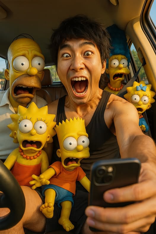 A 9:16 vertical 3D ultra-realistic image of a South Asian man in the front seat of a car, taking a wild selfie with The Simpsons family. The man's facial features, expression, and identity must be preserved exactly as in the original photo — do not alter, stylize, or change his face in any way. He’s wearing a black sando and shorts, barefoot, and making an exaggerated screaming face while holding the phone. Homer sits in the passenger seat making a goofy face, and the backseat is packed with Bart, Lisa, Marge, and Maggie — all with shocked or hilarious expressions. The car interior is richly detailed with soft golden sunlight coming in from the windows, giving the scene a cinematic, vibrant energy. The Simpsons characters retain their cartoonish look but are rendered in realistic 3D with full texture. The scene is chaotic, funny, and made for virality. Maintain photorealism for the human subject, and cartoon-realistic style for the Simpsons.