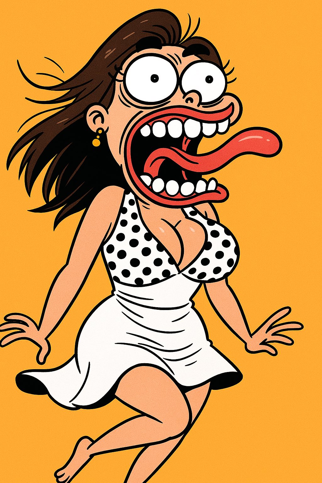 Turn the uploaded photo into a 2D digital cartoon illustration in an absurd and expressive comic style. Make the character's eyes bulging wide, mouth extremely open in an exaggerated, disproportionate way, tongue sticking out, and teeth large and messy. The facial expression should be overly dramatic and comical. Use a bold and humorous drawing style with thick outlines and bright flat colors. Set the background as a solid, vibrant color (such as orange or yellow) to make the character pop. Keep the same pose and outfit as the original photo but simplify the design into a cartoon style. The body can be floating or posed in a dramatic, funny motion to enhance the visual effect. tat mysut aindy